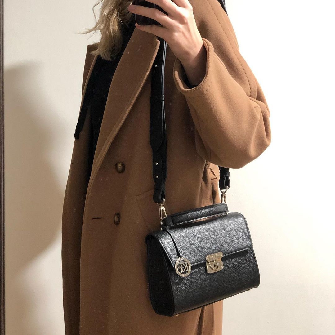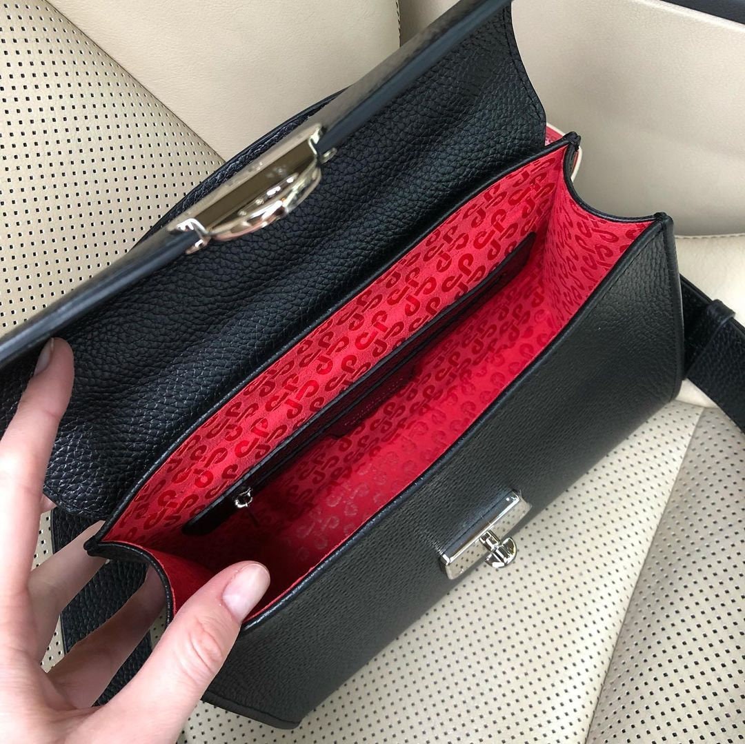 Black genuine leather handbag from Ukrainian designer Katerina Fox. The internal space of a bag is equipped with three spacious compartments and two patch-pockets and one zipper pocket. One of the spacious compartments is closed with a zipper. The bag is closed with a clasp. The bottom of the bag is protected with metal legs. There is a long handle that allows you to wear the bag on the shoulder. The kit also includes a storage bag.