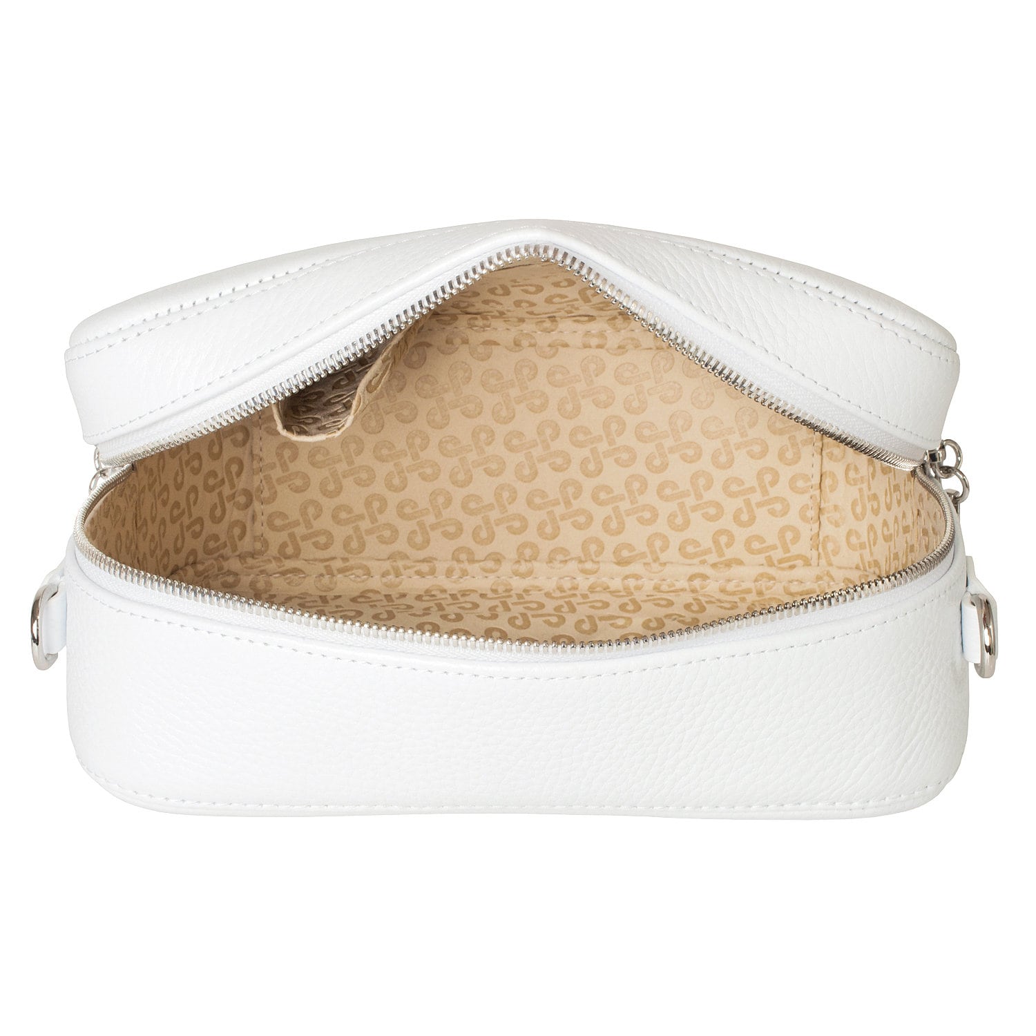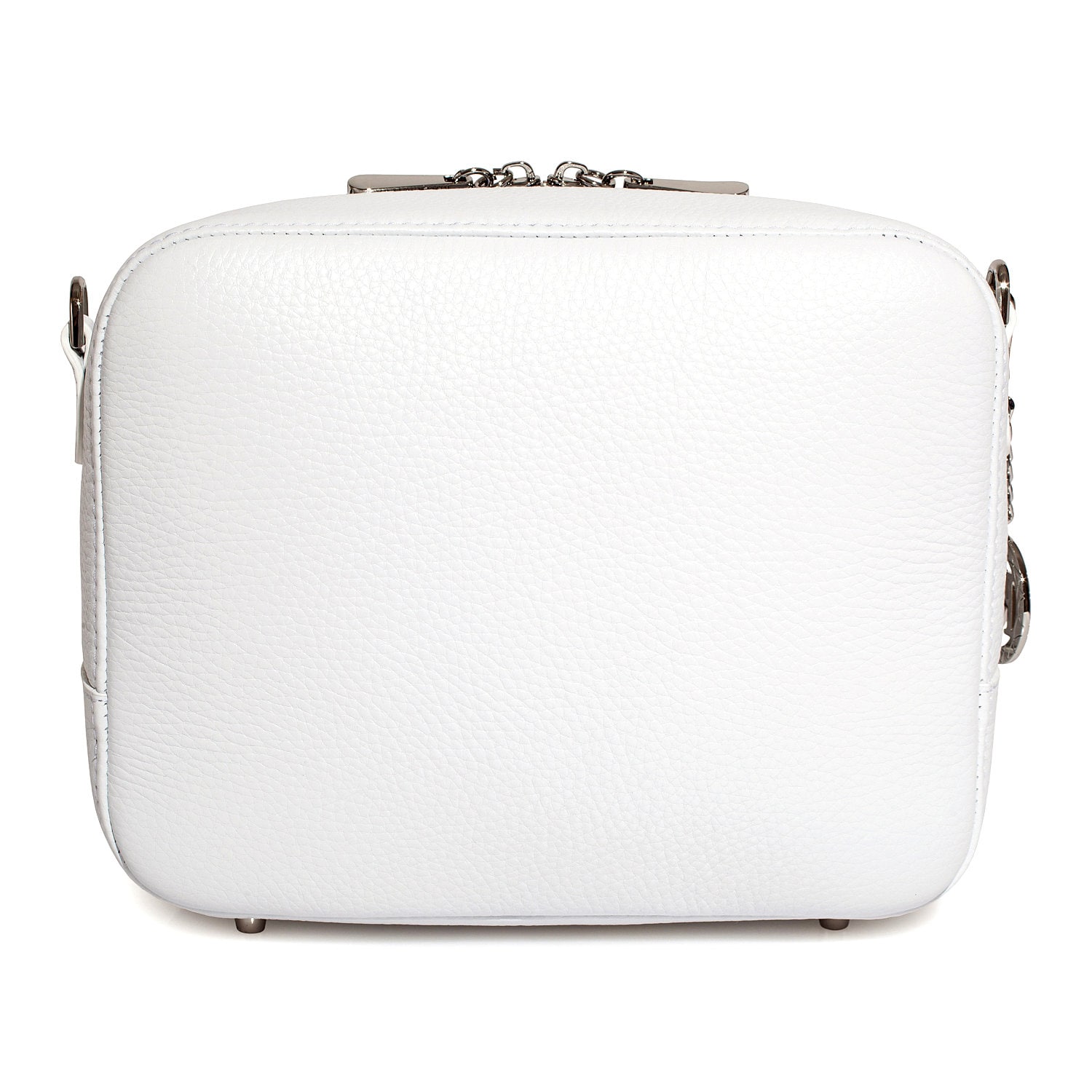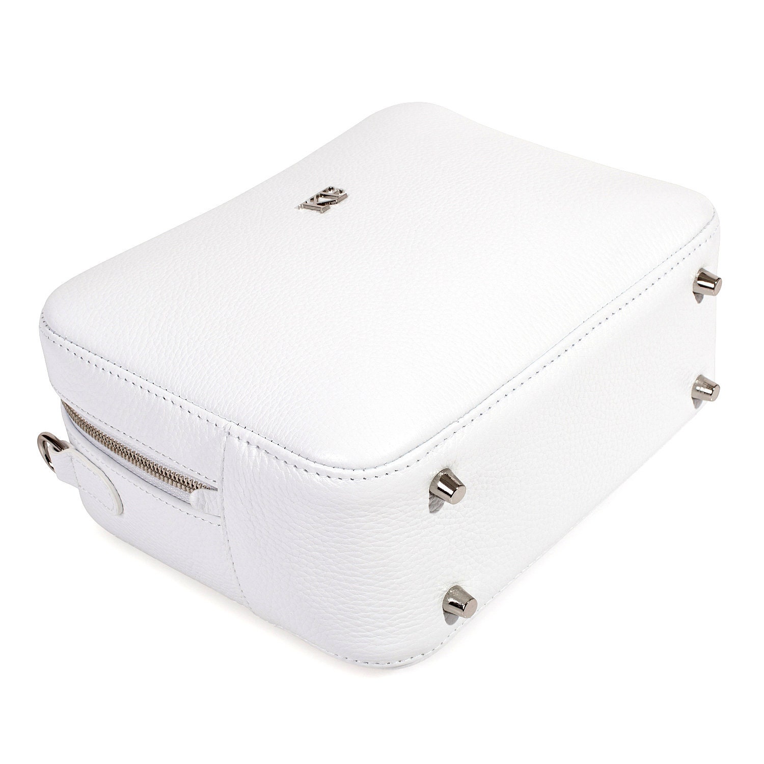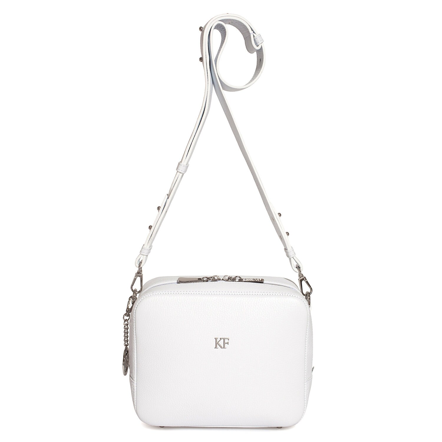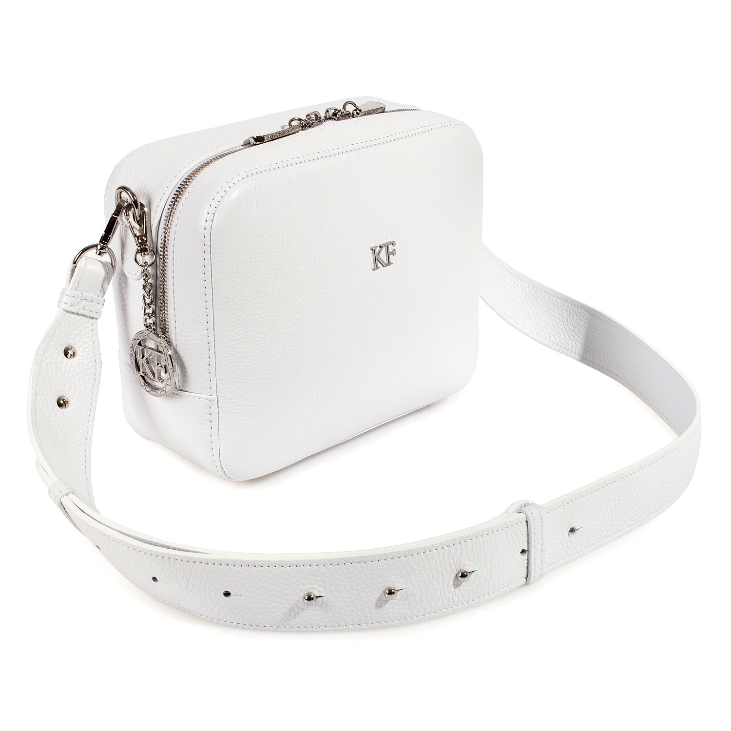 White genuine leather woman shoulder bag from ukrainian designer Katerina Fox. Fashionable and elegant modern bag KF for bright girls and women. This bag is able to attract attention and highlight your exquisite taste. The internal space of a bag is equipped with one spacious compartment and one zipper pocket. The bag is closed with a zipper. The length of the strap is adjustable. The kit also includes a storage bag.