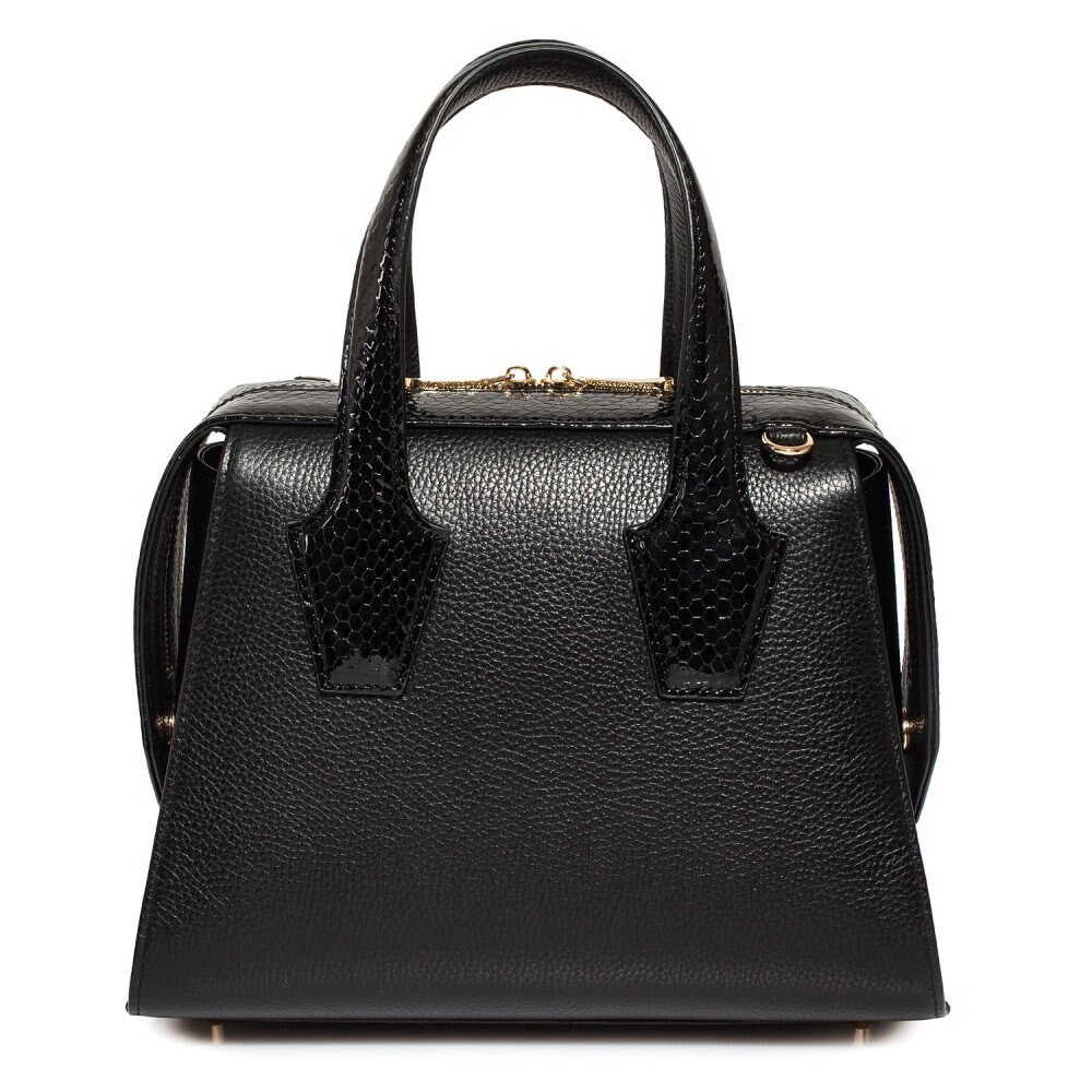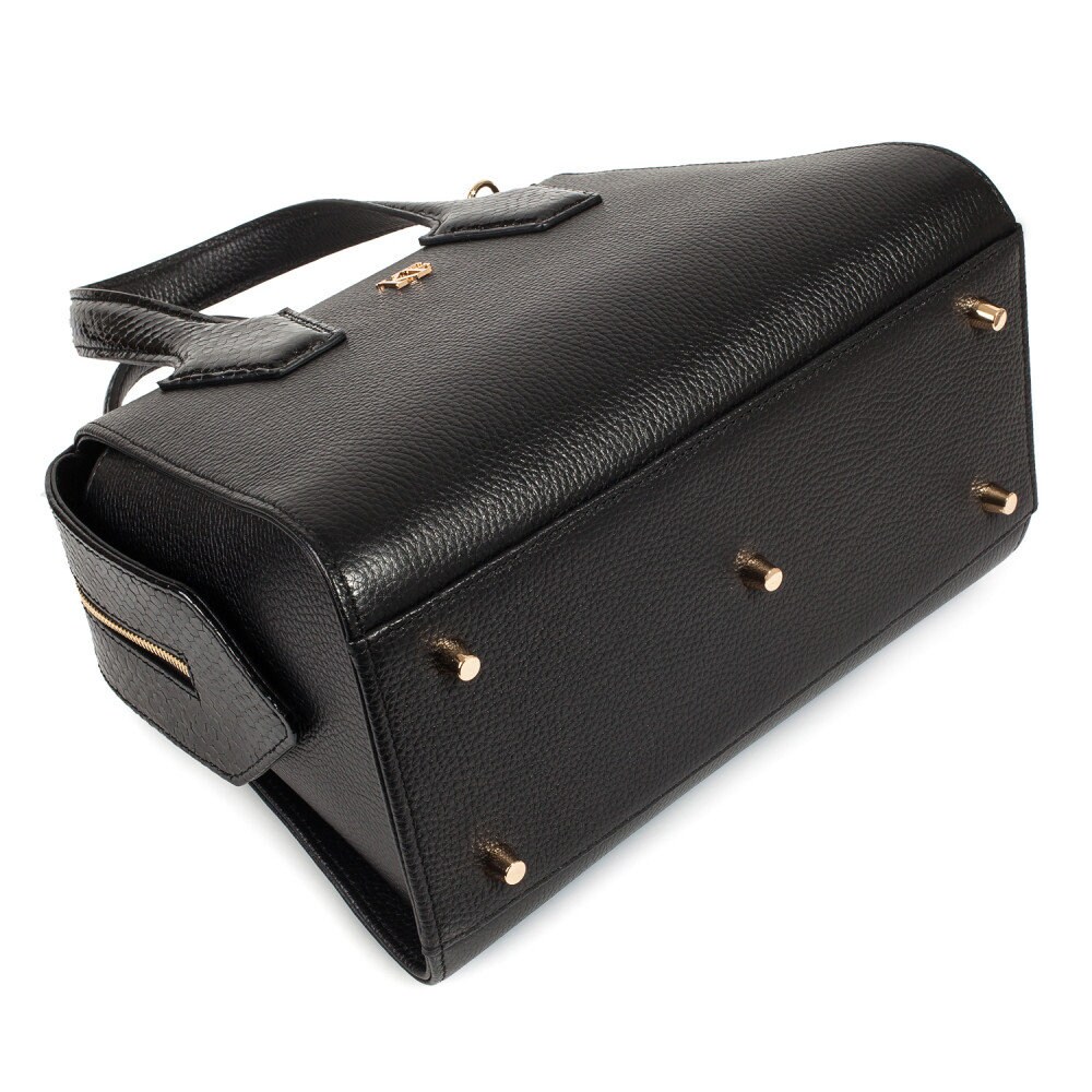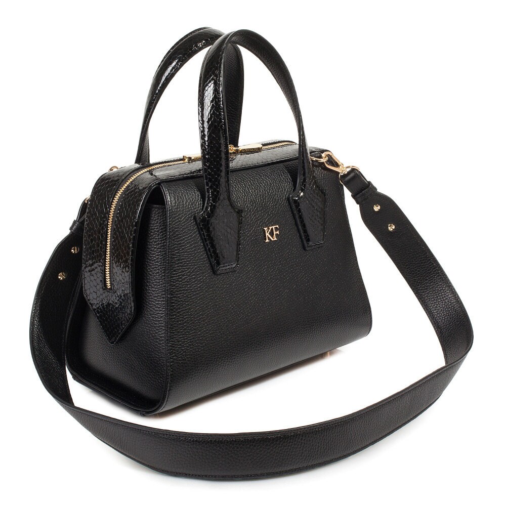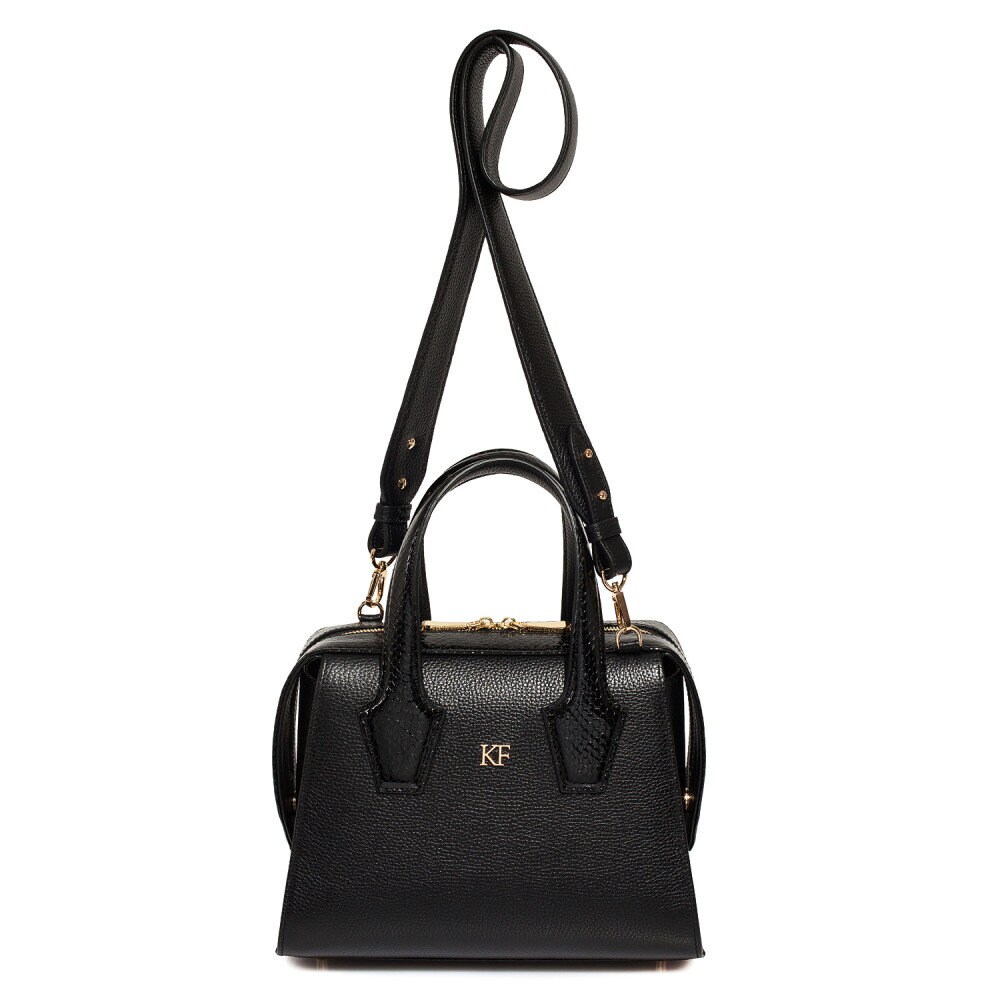 Black genuine leather handbag from Ukrainian designer Katerina Fox. This model is designed for women who appreciate the sleek design combined with functionality and comfort. High-quality and reliable hardware ensure long service bags. The internal space of a bag is equipped with one spacious compartment and two pockets. The bag is closed with a zipper. The bottom of the bag is protected with metal legs. There is a long handle that allows you to wear the bag on the shoulder. The kit also includes a storage bag.