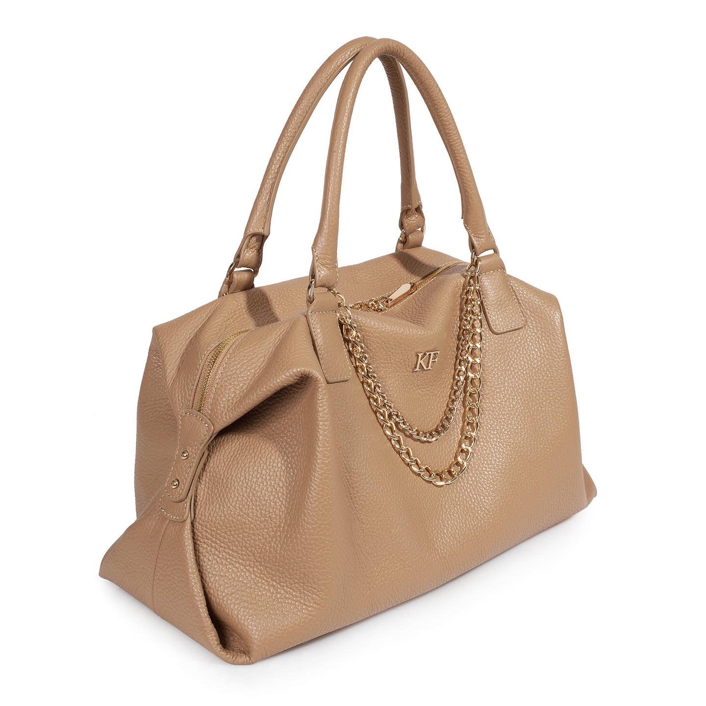 Dark beige genuine leather woman handbag from ukrainian designer Katerina Fox. Leather bag soft original shape will fit any style. Double chain, of course, adorns this model and highlights of many of these. All hardware what we use is good quality, reliable and durable. Inside is one large compartment and one small pocket with zipper for small items, closes with a zipper. Inside the bag one large compartment, two pouch pockets and one zip pocket, bag closes with a zipper. Convenient short handle. This bag is an indispensable accessory in your wardrobe!